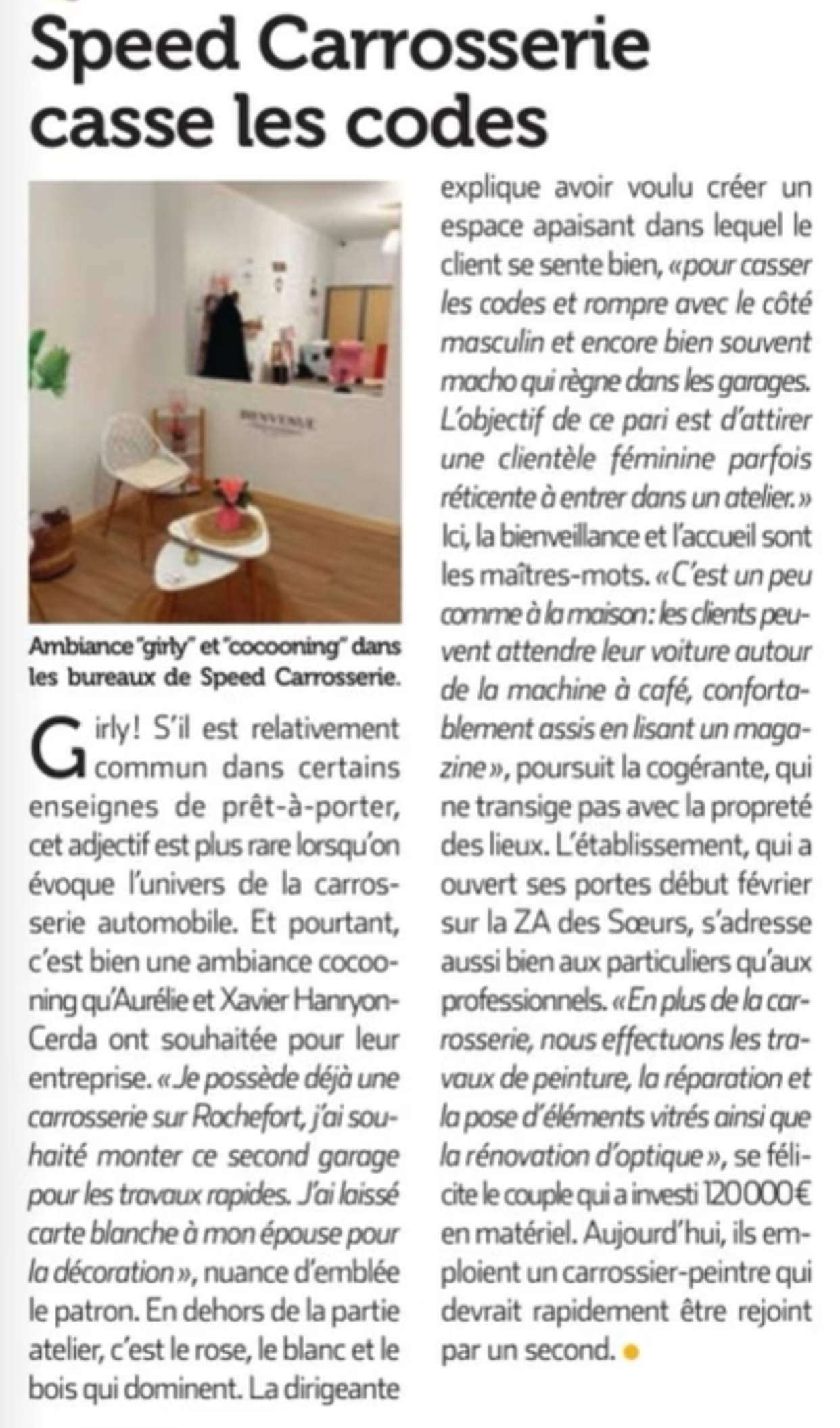 Speed Carrosserie, c’est une équipe parfaitement formée avec Teddy Leroux, 16 ans d’expérience en carrosserie / peinture et chef d’atelier, Xavier Hanryon-Cerda, gérant, et Aurélie Hanryon-Cerda Rumebe, responsable administrative et financière, qui vous accueillent dans une ambiance cocooning. Cette dirigeante de 37 ans a voulu « casser les codes » d’un monde masculin en apportant sa touche de rose girly, de blanc et bois, pour espérer conquérir une clientèle plus féminine et créer un espace apaisant dans lequel le client se sente bien, elle ne transige pas avec la propreté et l’hygiène.